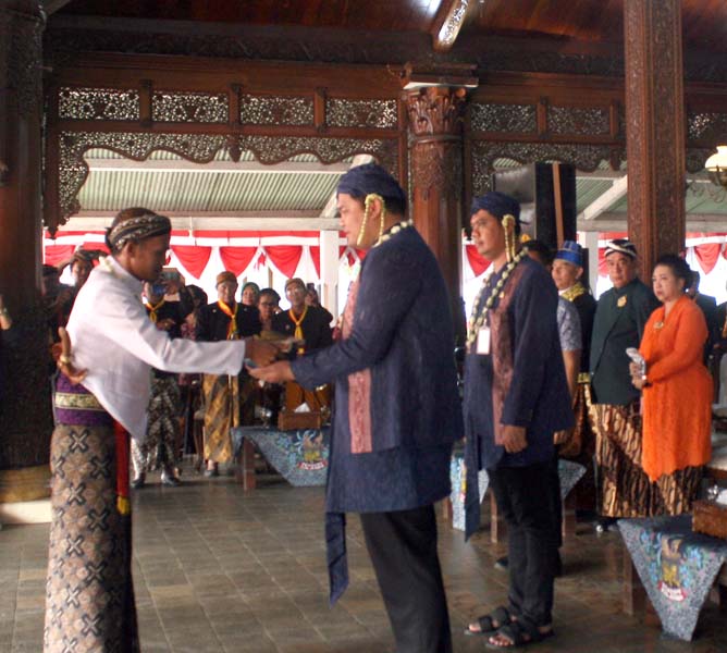 Begitu iring-iringan kirab tiba di pendapa, KRT Anam Setyodipuro (Ketua Yayasan Hadipuran Praja Manunggal) selaku panitia pelaksana melaporkan jalannya kirab kepada Bupati yang didampingi Wakil Bupati. Di situ tampak, GKR Koes Moertriyah Wandansari (Pengageng Sasana Wilapa/Pangarsa LDA), KPH Edy Wirabhumi (Pangarsa Pakasa Punjer) dan KP Bambang S Adiningrat ikut menyambut.