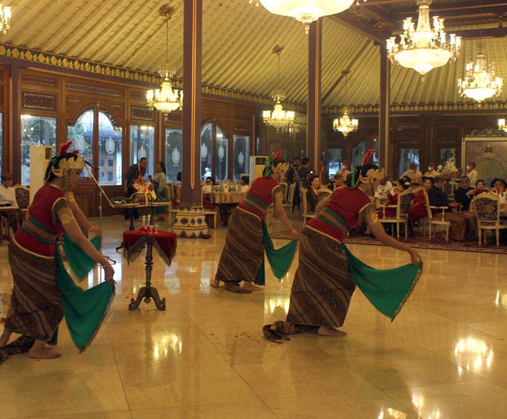 Tuan rumah menyajikan tari “Srimpi Sangupati” yang diciptakan pada zaman Sinuhun PB IV. Tarian yang memperlihatkan simbol jamuan penyambutan tamu dengan minum bersama, adalah penggambaran siasat Sinuhun PB IV yang ingin menjebak pemimpin Belanda dalam rangka perlawanan. Namun saat menjamu tamu dari Republik Madagaskar, Jumat sore itu, minum teh bersama sambil berdiri dimaksudkan untuk menyambut tamu.