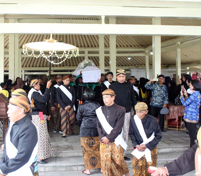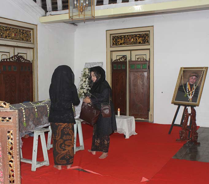 Kepergian KRMH Herjuno Suryo Wijoyo, diantar dalam sebuah upacara adat penuh duka-cita di Pendapa Sasana Mulya, Jumat siang tadi (17/10). Upacara prosesi pelepasan jenazah dilakukan sesuai tatacara adat Kraton mataram Surakarta, dimulai puklul 13.00 WIB. Sejumlah pelayat khususnya kalangan keluarga dekat, kerabat sentana, jajaran Bebadan Kabinet 2004 dan para abdi-dalem dari berbagai elemen, ikut melepas jenazah.